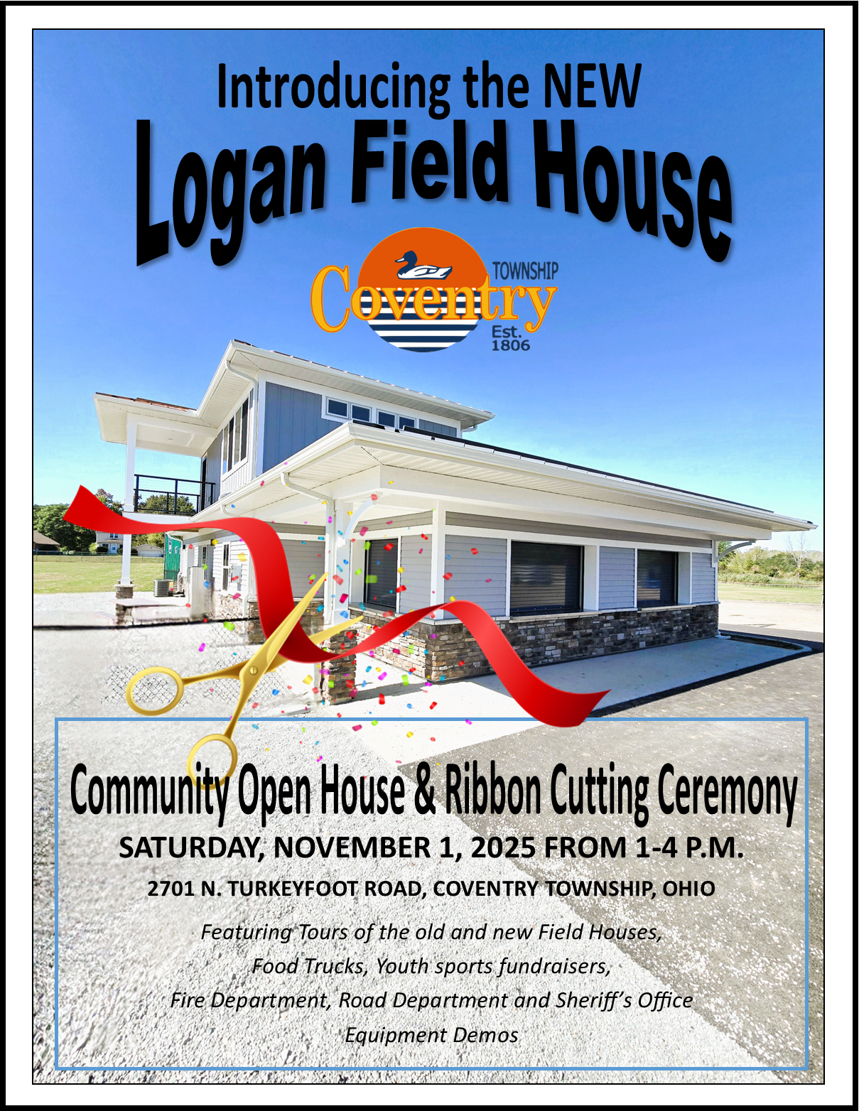 « All Events LOGAN FIELD HOUSE – Ribbon Cutting and Community Open House November 1 @ 1:00 pm - 4:00 pm « Township-Wide Trick-or-Treat Night Resident Leaf Drop-Off » + Google Calendar+ iCal Export Details Date: November 1 Time: 1:00 pm - 4:00 pm Event Category: Special Events Organizer Coventry Township Phone: 3306440785 Email: trustees@coventrytownship.com Website: https://coventrytownship.com Venue Logan Field 2701 N. Turkeyfoot Rd. Coventry Township, OH 44319 United States + Google Map Related Events Township-Wide Trick-or-Treat Night October 25 @ 5:30 pm - 8:00 pm Resident Leaf Drop-Off November 8 @ 9:00 am - 3:00 pm|Recurring Event (See all)One event on November 22, 2025 at 9:00 am Resident Leaf Drop-Off November 22 @ 9:00 am - 3:00 pm|Recurring Event (See all)One event on November 22, 2025 at 9:00 am